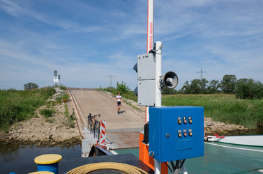 Another bright blue day to begin our cycling. Starting again on cobbletones away from the city and down to the river. We rode on a bike path along the river for the first 15 km (9 mi). These bike paths were old roads with grass growing in the middle. You had to stay on the narrow path for safety. We passed by some pastures with a flock of sheep and a dog keeping watch. At the end of the bike path, we came to the river and our first ferry ride of the day. The river wasn't very wide so I guess a small ferry is more efficient than building a bridge. There was only one car with us and our fellow cyclists. It only took us a couple of minutes to cross. We waited to cross because one of the bikers hadn't arrived with us at the ferry landing. The guide said he would wait and cross with him.