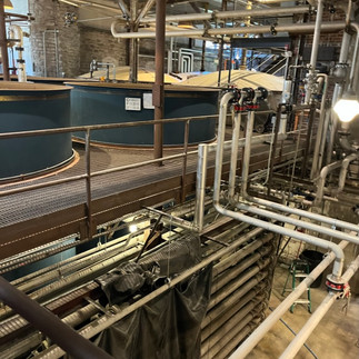 Next, our tour entered the building so we could see the distillation process. The middle top photo is the scale hoppers that measure the bulk materials. The photo on the top right is the roaster. The bottom row shows the Bourbon mash. Mashing is the process that creates and extracts both fermentable and non-fermentable sugars from the grain. These tanks were 11,150 gallons. Although there is no law regarding the water source to make bourbon, all of the distilleries that we visited agree that Kentucky limestone water is the best. Limestone water has a high pH value which aids fermentation. The final picture at the bottom right is the column still.